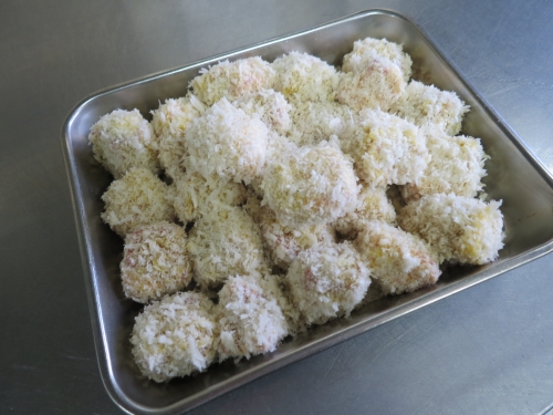 1に小麦粉、溶き卵、パン粉の順でパン粉を付ける